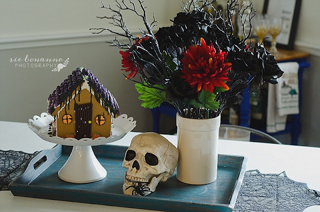 Last year, I hit some after-Christmas sales and bought several gingerbread house making kits. I thought it would be fun to let my kids decorate the houses for holidays other than Christmas. I pulled one kit out a few weeks ago and let them create a Haunted Gingerbread House. They loved it! I think it turned out great and was happy to add it to my dining room table centerpiece.